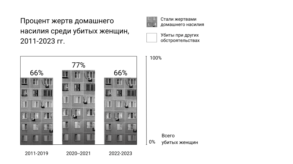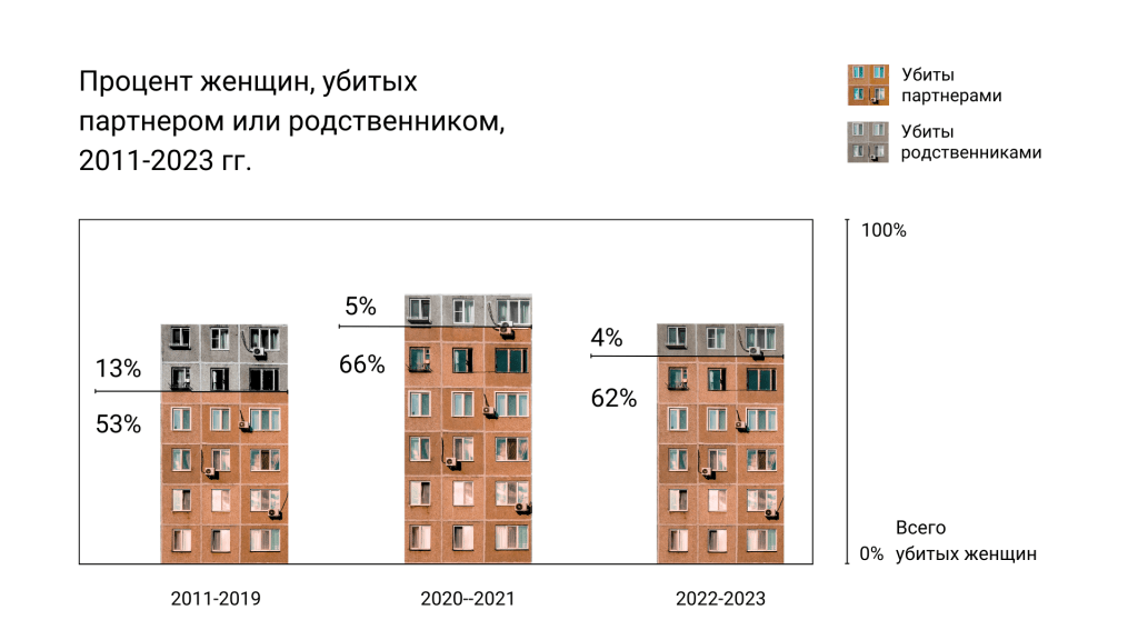С 2011 по 2019 года 66% убитых женщин стали жертвами домашнего насилия, то есть погибли от рук партнеров или родственников, которые до этого систематически применяли насилие по отношению к ним. С 2020 по 2021 года во время пандемии и режима самоизоляции уровень домашнего насилия среди приговоров за убийство женщин поднялся до 71%. С 2022 по 2023 года 67% убитых женщин стали жертвами домашнего насилия. Всего с 2011 по 2023 год мы нашли в приговорах 17 173 женщин, ставших жертвами домашнего насилия.