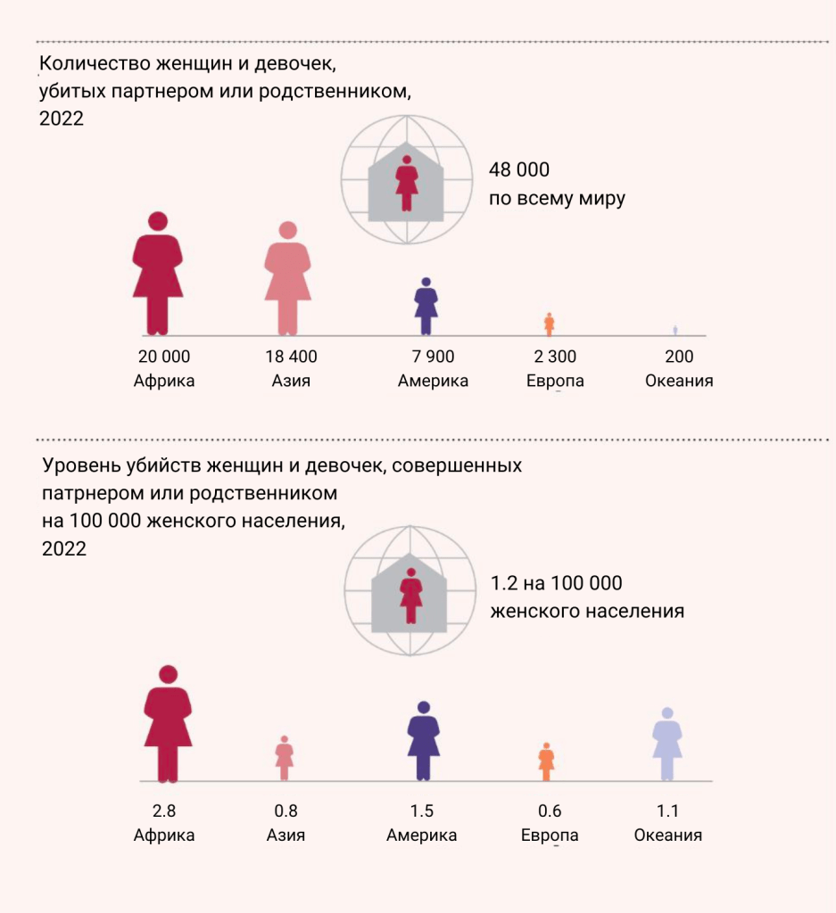 В 2022 году из каждых 100 000 женщин и девочек во всем мире примерно 1,2 были убиты своими интимными партнерами или другими членами семьи. Что касается региональных различий, имеющиеся данные показывают, что в Африке женщины и девочки подвергаются наибольшему риску быть убитыми своими интимными партнерами или другими членами семьи. В 2022 году уровень убийств женщин от интимного партнера/семьи в Африке оценивался в 2,8 на 100 000 женского населения по сравнению с 1,5 в Америке, 1,1 в Океании, 0,8 в Азии и 0,6 в Европе.