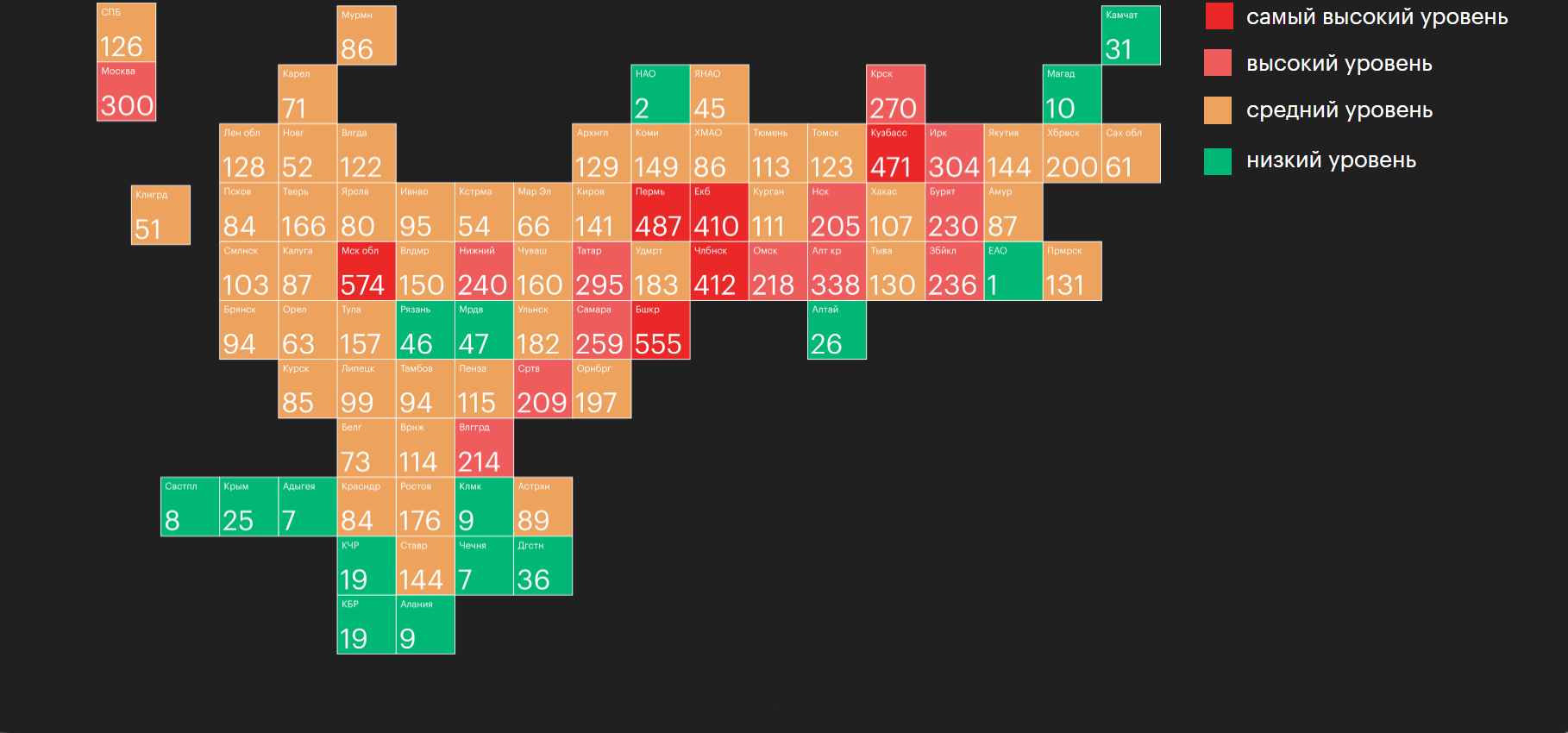 В тексте каждого приговора содержится информация о суде, который его вынес. Поэтому мы смогли узнать региональную динамику вынесенных по домашнему насилию приговоров.